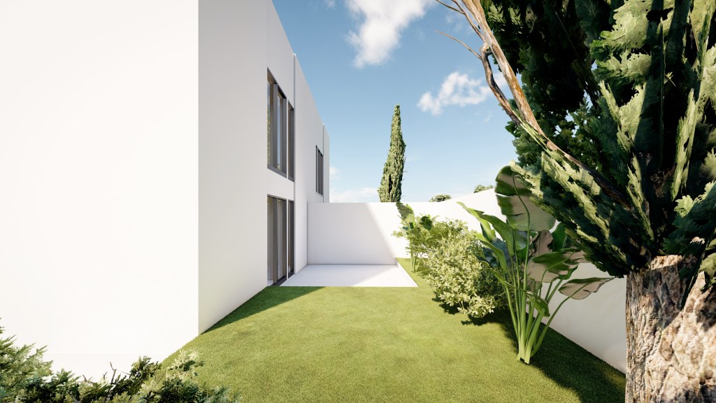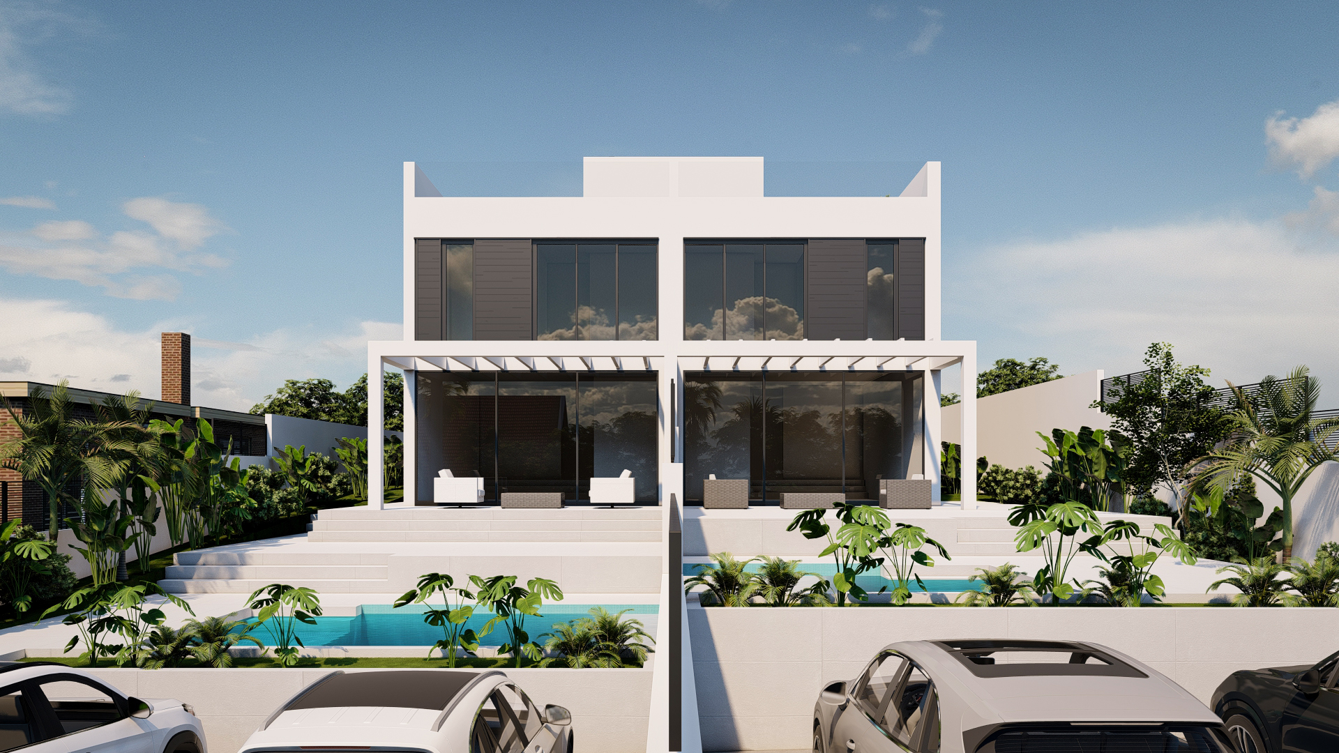 These modern semi-detached luxury homes feature 3 spacious bedrooms, 3 bathrooms and a 173 m2 living area spread across two floors, situated on a 387 m2 plot. Each house includes a 52 m2 private parking space for two cars, a garden with a private saline chlorination swimming pool, featuring a self-filling system, spacious outdoor terraces, and a stunning 70 m2 rooftop terrace.